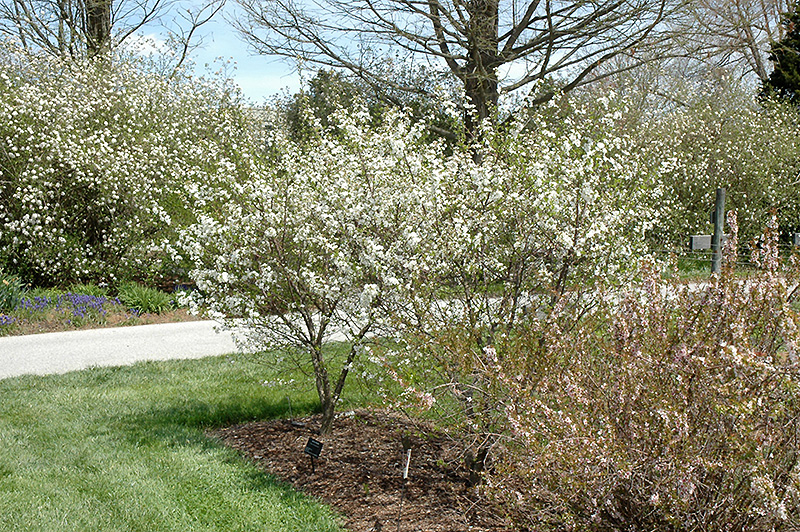 Carmine Jewel Cherry is draped in stunning clusters of fragrant white flowers along the branches in mid spring before the leaves. It has dark green deciduous foliage. The pointy leaves turn an outstanding yellow in the fall. The fruits are showy crimson drupes with hints of deep purple, which are carried in abundance in mid summer. The fruit can be messy if allowed to drop on the lawn or walkways, and may require occasional clean-up.