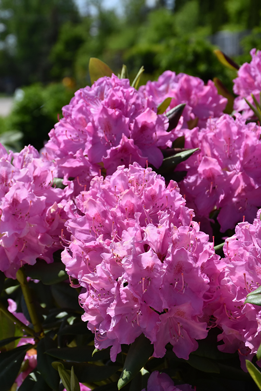 Roseum Pink Rhododendron is smothered in stunning clusters of pink trumpet-shaped flowers with lavender overtones and dark red spots at the ends of the branches in mid spring, which emerge from distinctive purple flower buds. It has dark green evergreen foliage. The large narrow leaves remain dark green throughout the winter.