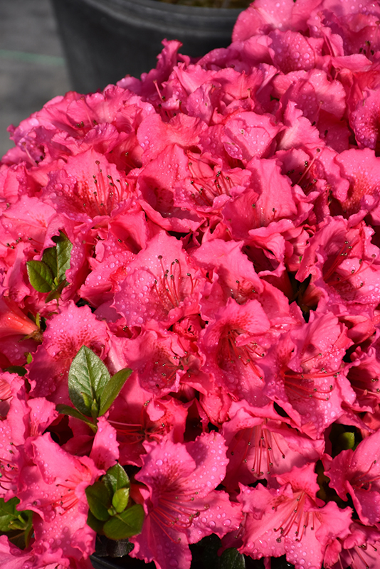 Perfecto Mundo Epic Pink® Azalea features showy clusters of hot pink trumpet-shaped flowers with red spots at the ends of the branches from mid spring to mid fall. It has dark green evergreen foliage which emerges light green in spring. The glossy oval leaves remain dark green throughout the winter.