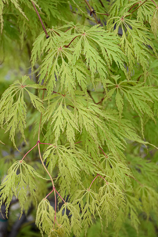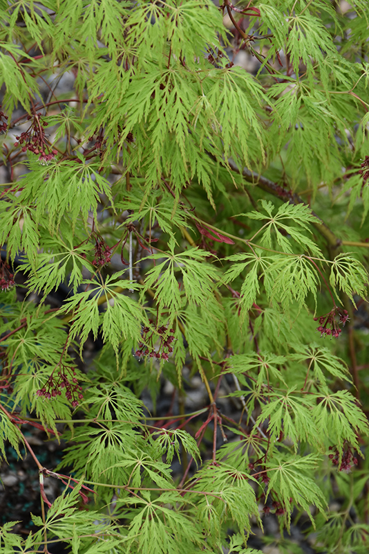 Wabi Sabi Maple is primarily valued in the landscape or garden for its cascading habit of growth. It has attractive dark green deciduous foliage which emerges light green in spring. The deeply cut lobed palmate leaves are highly ornamental and turn outstanding shades of orange, red and yellow in the fall. The red fruits are held in clusters in early spring. The rough gray bark and brick red branches add an interesting dimension to the landscape.
