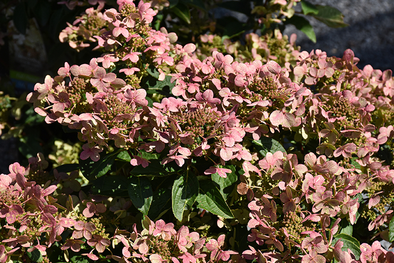 A showy, early blooming variety featuring panicles of mixed sterile and fertile cream flowers which turn pink to red in late summer to fall; acidic soil results in violet-blue highlights; regular pruning recommended to maintain bushy appearance