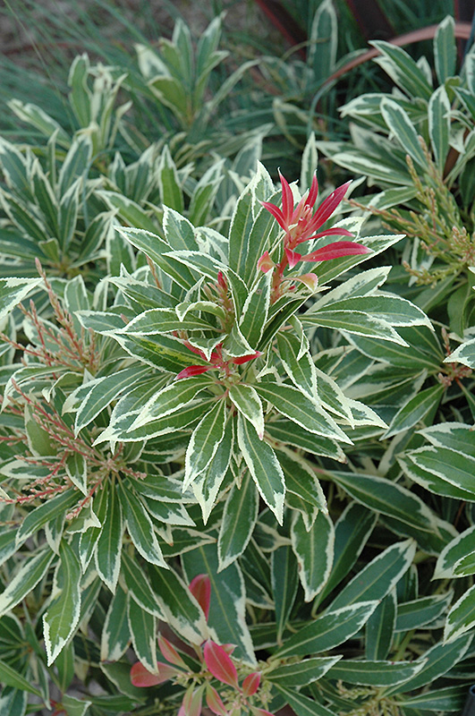 A stunning evergreen shrub cherished for its delicate and showy chains of small white bell-shaped flowers and bright red emerging foliage that turns dark green with a bright white edge; performs best in moist, organic and acidic soils; very showy